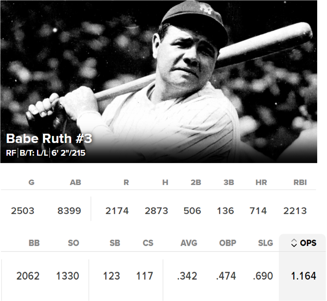 위의 기록이 타자의 스텟으로 가장 많이 사용하는 기록인데 "베이브 루스"는 메이저리그 정규시즌에 통산 2503경기에 출전해 홈런 714개, 타율 3할 4푼 2리, 득점 2174점, 타점 2213점, 그리고 장타율( .690)과 OPS(1.164)는 MLB 역대 1위를 기록하고 있는 최고의 타자였습니다. (투수로도 163경기에 나와 94승 46패 방어율 2.28을 기록했다.)