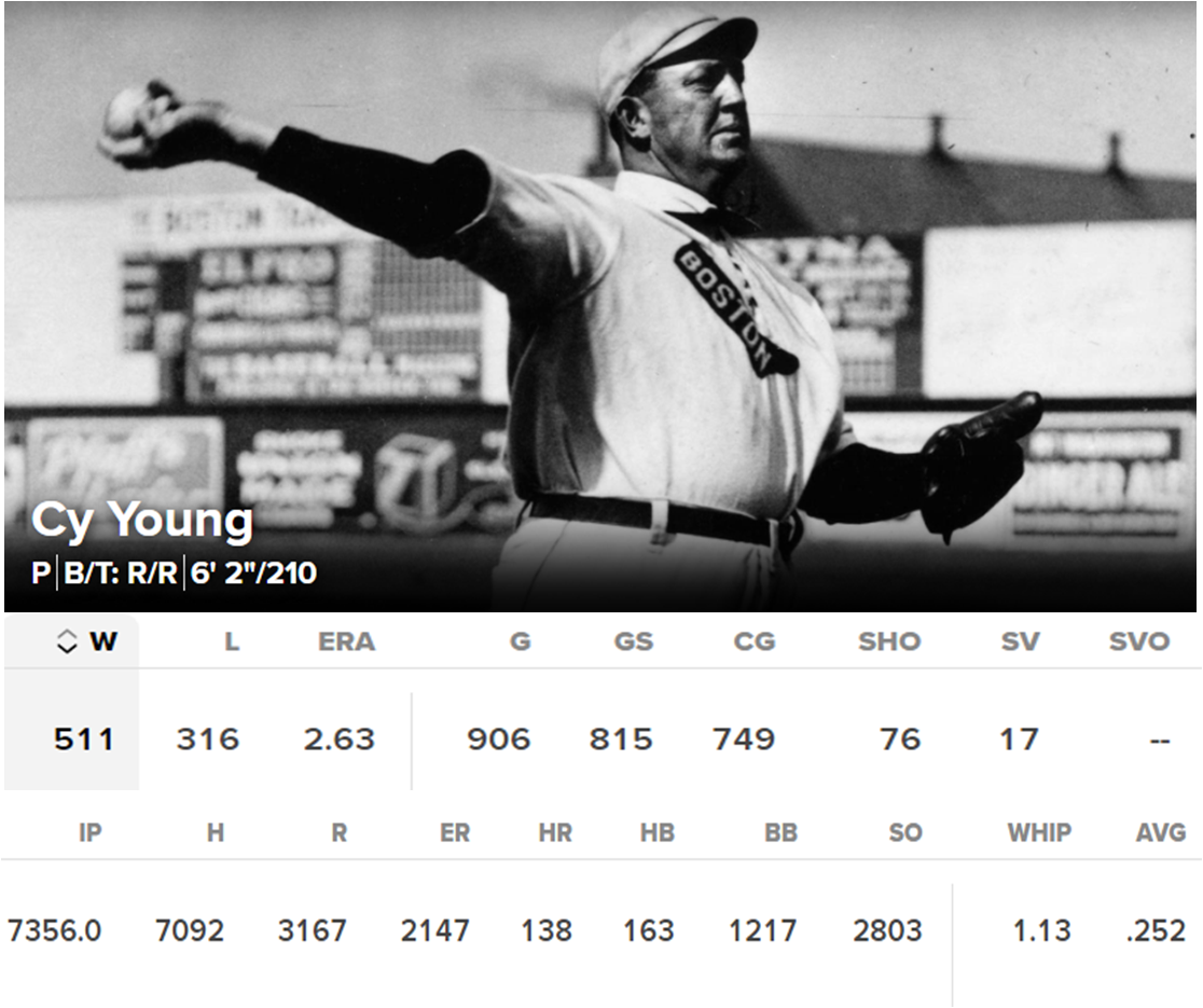메이저리그 역대 최고의 투수 "사이 영"은 MLB 통산 선발투수로 815경기에 출전해 무려 7356이닝을 책임지며 511승(316패)을 기록했는데 이 기록은 야구가 세상에서 사라질 때까지 깨질 수 없는 수치입니다.(역대 2위 기록이 "월터 존슨"의 417승이다)